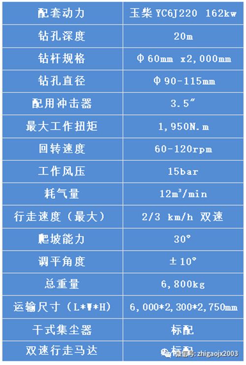 1、該鉆機(jī)配套動力為玉柴YC6J220,匹配12/15螺桿空壓機(jī),滿足90-115mm孔徑;