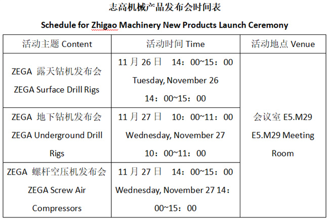 26號(hào)和27號(hào),志高將在E5.M29會(huì)議室舉辦3場(chǎng)產(chǎn)品發(fā)布會(huì),詳細(xì)介紹公司的露天鉆機(jī)、地下鉆機(jī)以及空壓機(jī)產(chǎn)品。在被展廳里的龐大機(jī)械吸引目光的同時(shí),您還可以來(lái)會(huì)議室參加它的發(fā)布會(huì),詳細(xì)了解它龐大身軀下的出色能力。帶有自動(dòng)集中潤(rùn)滑系統(tǒng)的ZEGA D490A、反循環(huán)勘探鉆機(jī)ZEGA D480RC、露天一體式牙輪鉆機(jī)ZEGA R8100……聽(tīng)聽(tīng)產(chǎn)品的性能和配置介紹,或許它比外型更能打動(dòng)你。2024年11月26日至29日,我們?cè)谏虾P聡?guó)際博覽中心E5.511展位等你!