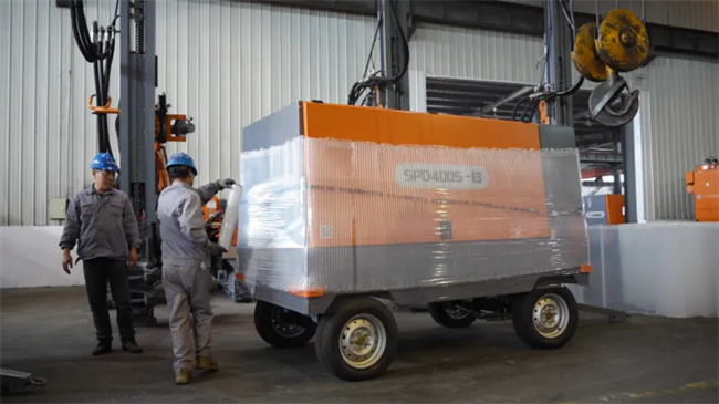 工人在對出口空壓機進行覆膜包裝